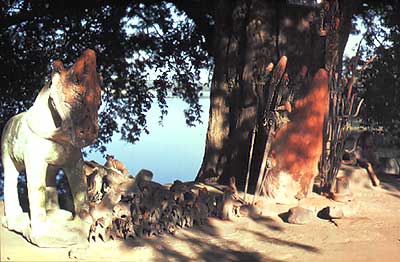 Wir waren ja erst einen Monat in Indien.Top^ Tourmap 4. Kaleshwar ----- Tadoba- Nationalpark: So zogen wir wieder Richtung Norden, überquerten aber diesmal aber das Sangam der 3 Flüsse mit einem Boot, und mußten dann 2 Std. auf einem Ochsenkarrentaxi unter praller Sonne vom Ufer über kilometerweite Sandflächen bis zur Grenze Andhra-Pradesh- Maharasthra. Dort angekommen war diese drückende Stimmung der Menschen schlagartig verschwunden. An der Grenze erfuhren wir über eine Hirnhautentzündung-Epedemie in der Gegend, aus der wir gerade kamen. Es erklärte einiges. Tempel der Gond- Tribals
